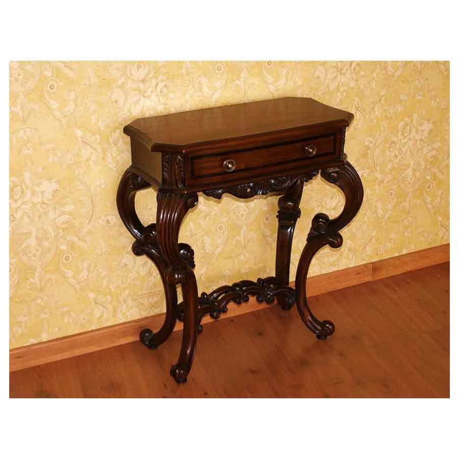 Το ταίριασμα μιας αέρινης σκαλιστής κονσόλας και ενός ασυναγώνιστου βοηθητικού τραπεζιού. Θα σταθεί υπέροχα σε κάθε μεριά του σπιτιού. Το μεγάλο συρτάρι του ακολουθεί πολύ διακριτικά την ελαφριά τοξοτή κλίση της όψης του επίπλου και στολίζεται με ένα ιν-λέι σκούρο περίγραμμα. Διαστάσεις 75cm Ύψος X 65cm Φάρδος X 34cm Βάθος.