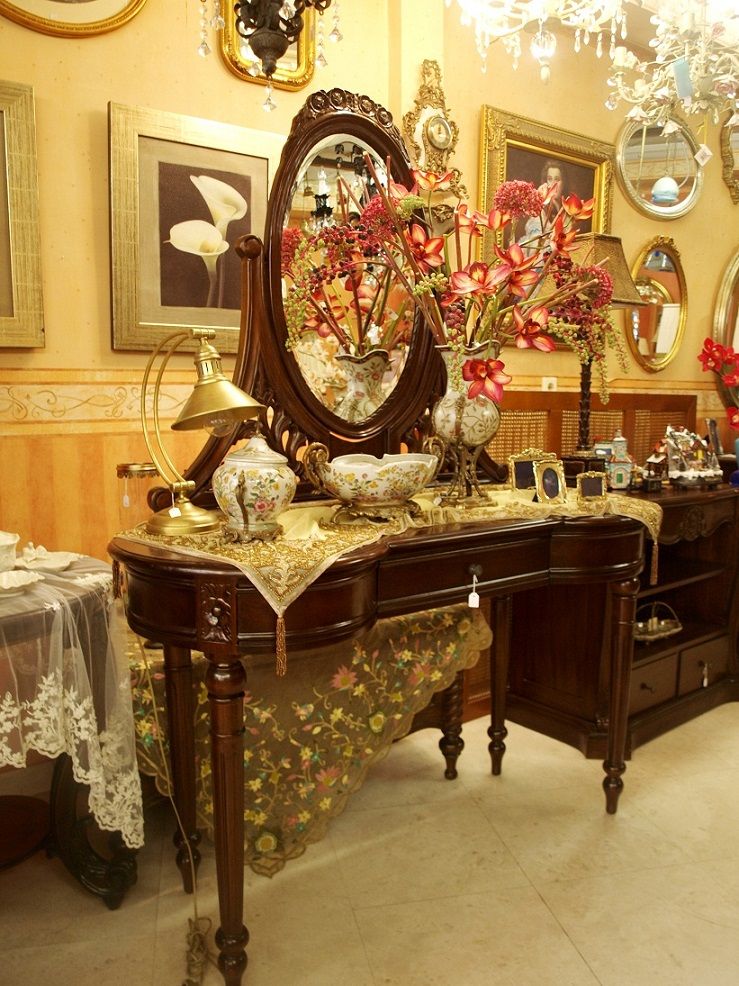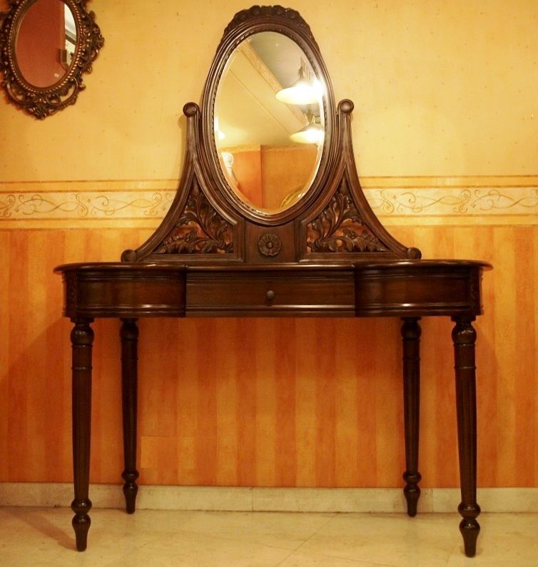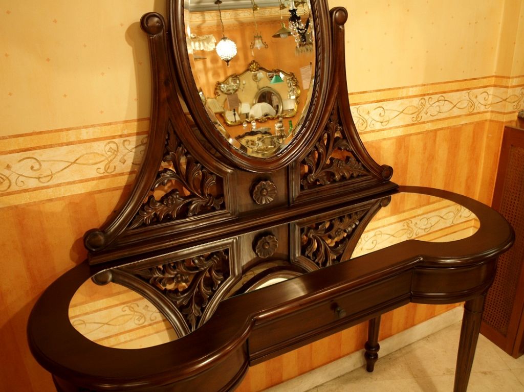 Μια μικρή σπουδή στην κομψότητα. Εξαιρετικές λεπτομέρειες σε σκαλισμένο στο χέρι μασίφ ξύλο μαονιού. Τα ψηλά λεπτά πόδια και οι απαλές γραμμές δένουν με τους φίνους καθρέπτες στην τάβλα και στην οβάλ σκαλιστή κορνίζα.